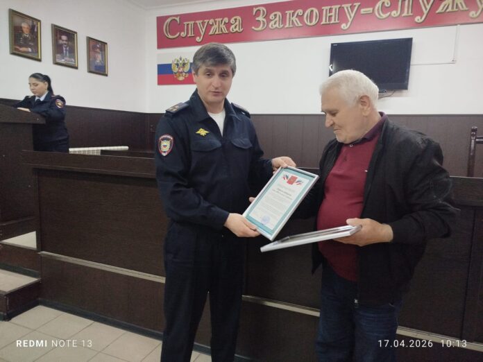 Нусредин Исрапилов вручил председателю Совета ветеранов МВД города Буйнакска Низару Омарову Почётную грамоту и Благодарственное письмо.